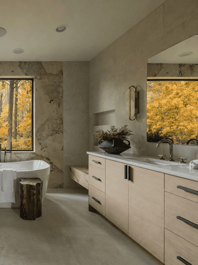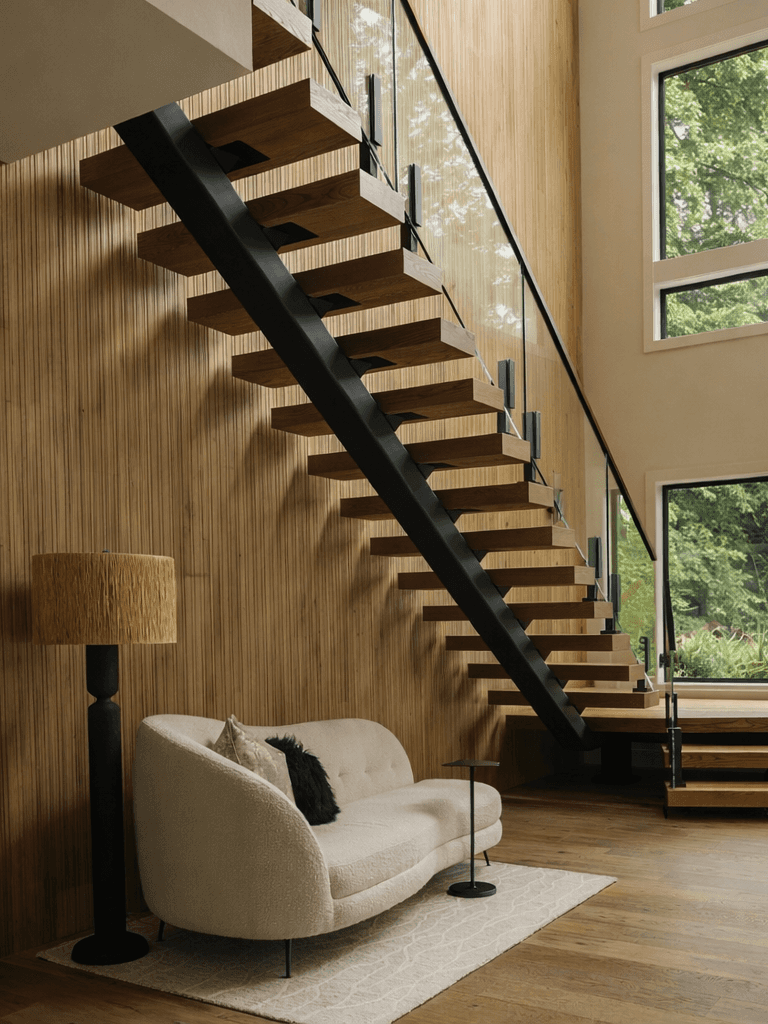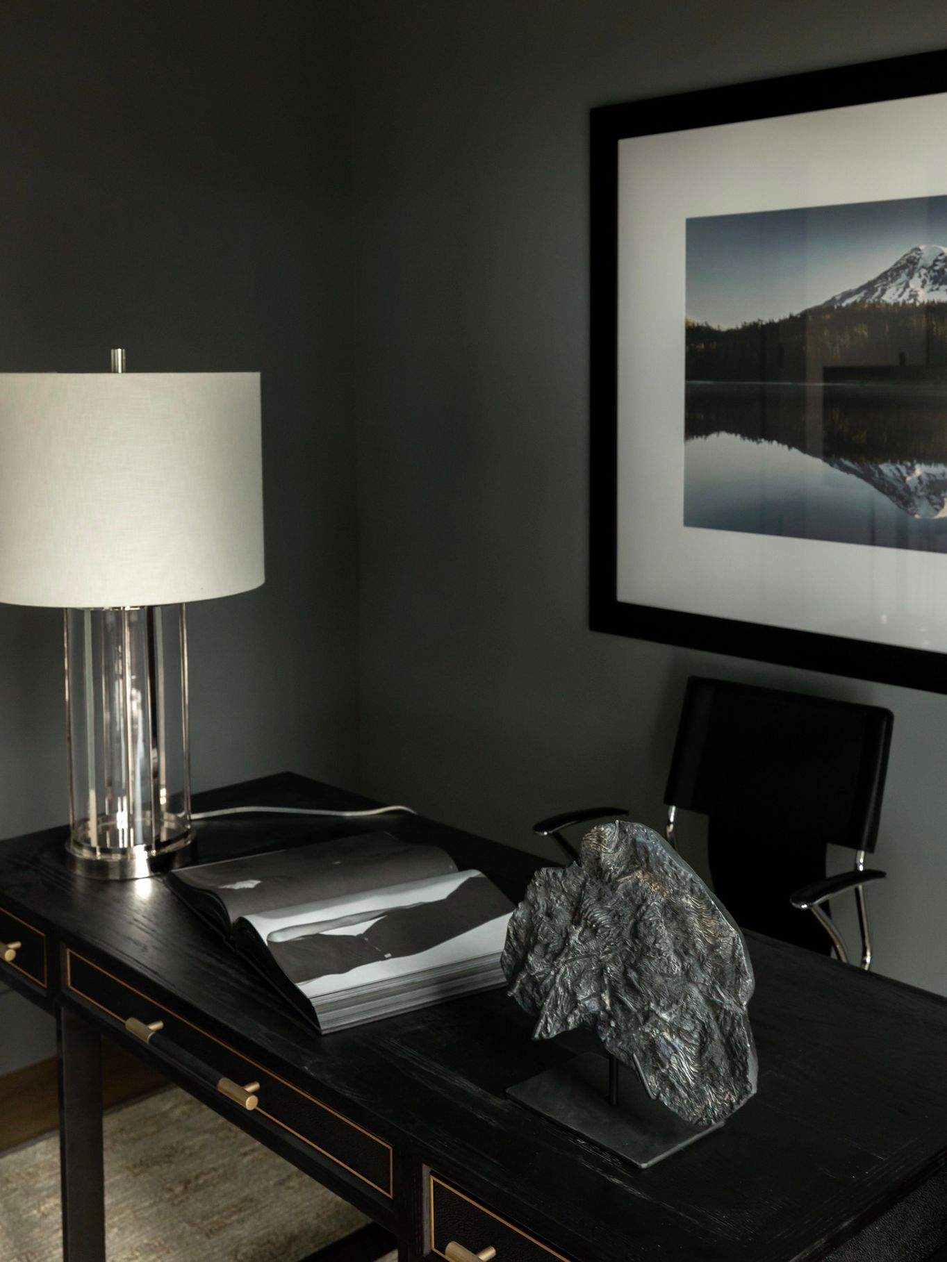 This home is part of an ongoing project for a family of five in Medina, this 7,000-square-foot home overlooking Lake Washington draws inspiration from the moody palettes and rich wood tones of the greater Seattle area. Soaring ceilings and a sculptural glass staircase anchor the architecture, shaping a masculine, quietly edgy retreat.