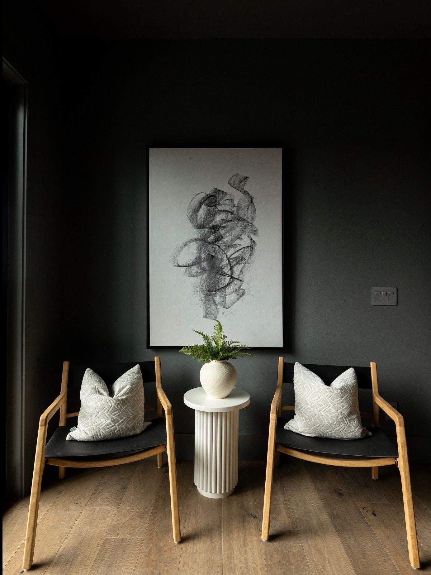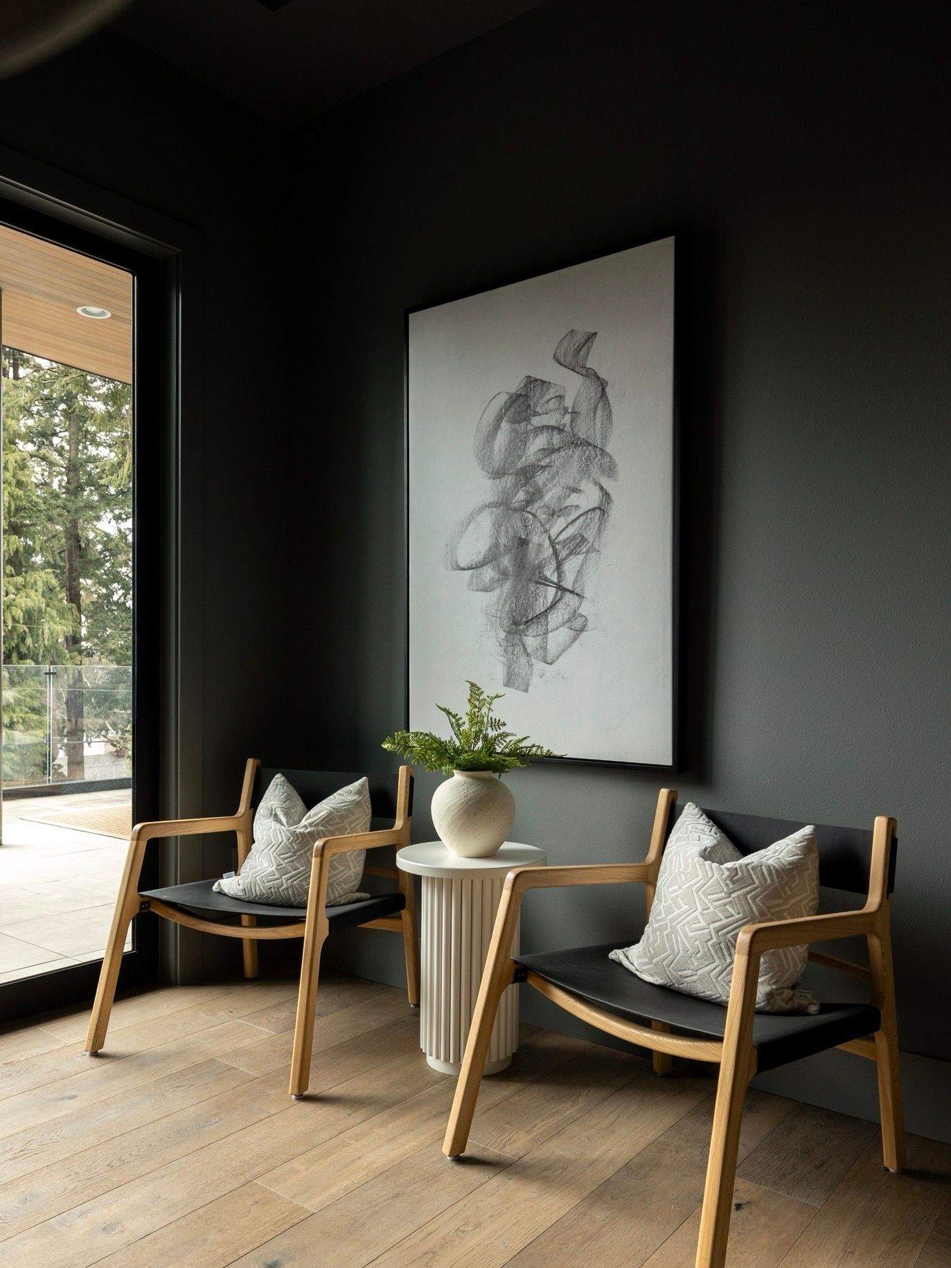 Grounded in durable, natural materials, the interiors layer deep blacks with heavy neutrals and pewters to create warmth and dimension. Completed in phases—first furnishing and art curation, then wallpaper and architectural wall treatments—the home continues to evolve, gaining character alongside the family it was designed for.