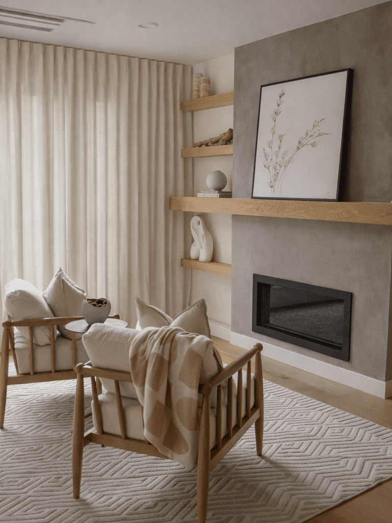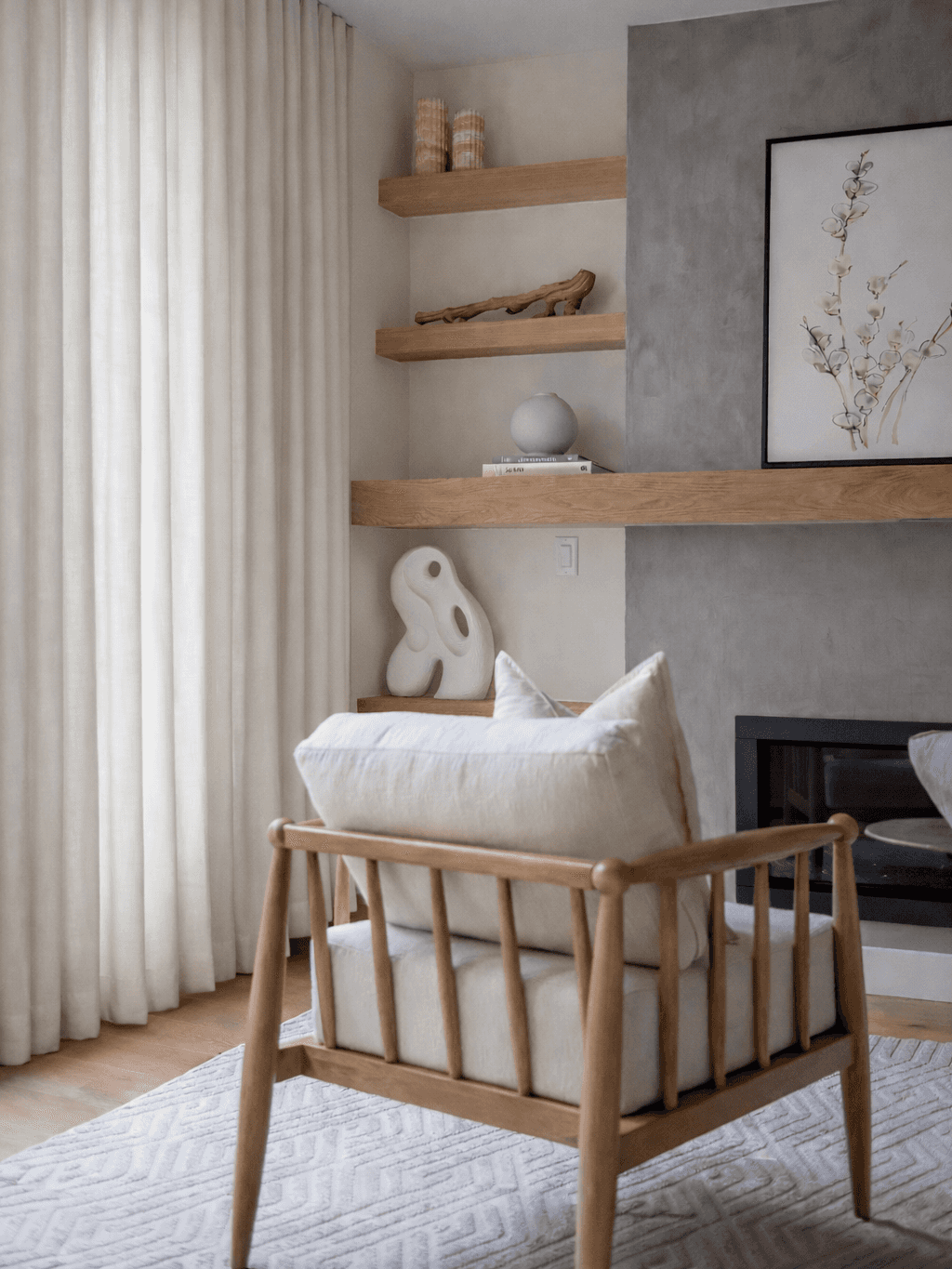 For this project, I helped curate the overall vision for each space, thoughtfully selecting custom curtains, plaster finishes, lighting, furniture, accessories, and bespoke shelving to create a cohesive and elevated design throughout.
