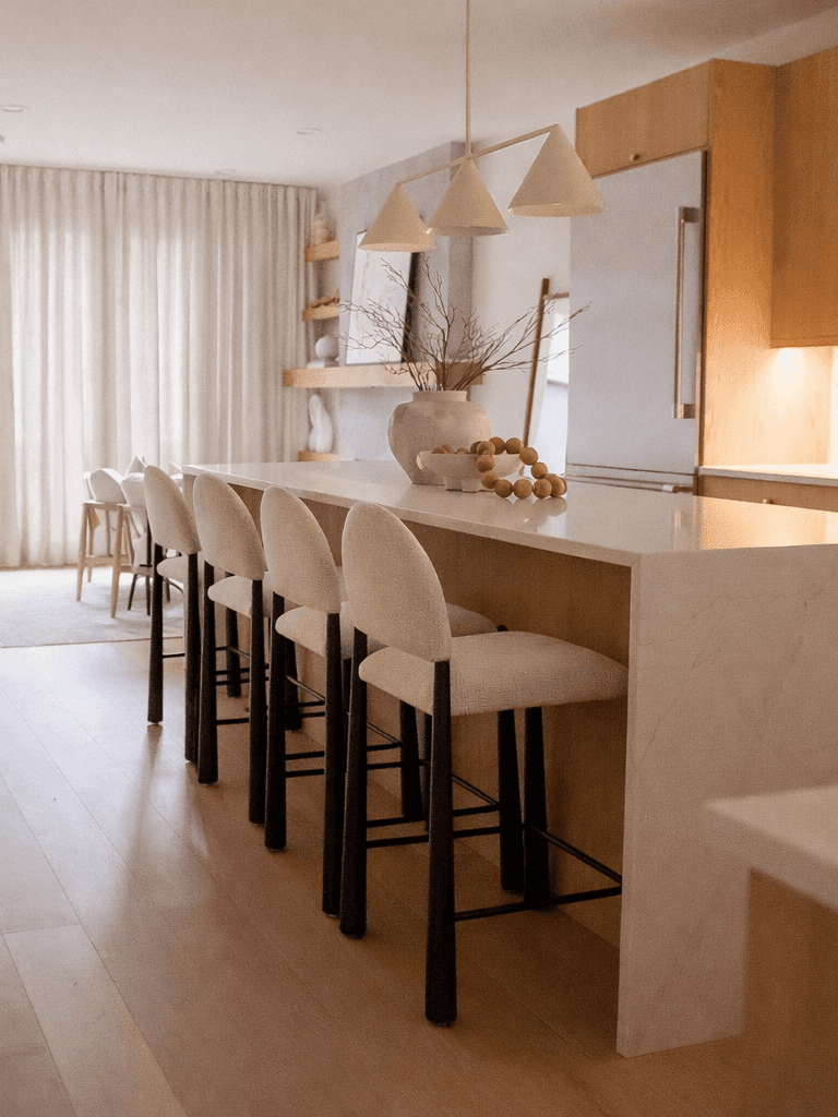 We embraced a restrained palette of alabaster whites, warm linens, and layered neutrals, accented with subtle touches of black to ground the spaces. To add depth and warmth without compromising the serene atmosphere, the walls were finished in Venetian plaster, creating soft movement and texture. Custom floor-to-ceiling linen drapery enhances the sense of height and, when drawn, transforms the home into a cocoon-like retreat that feels miles away from the city.