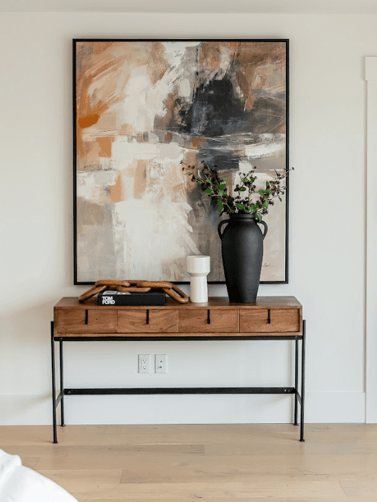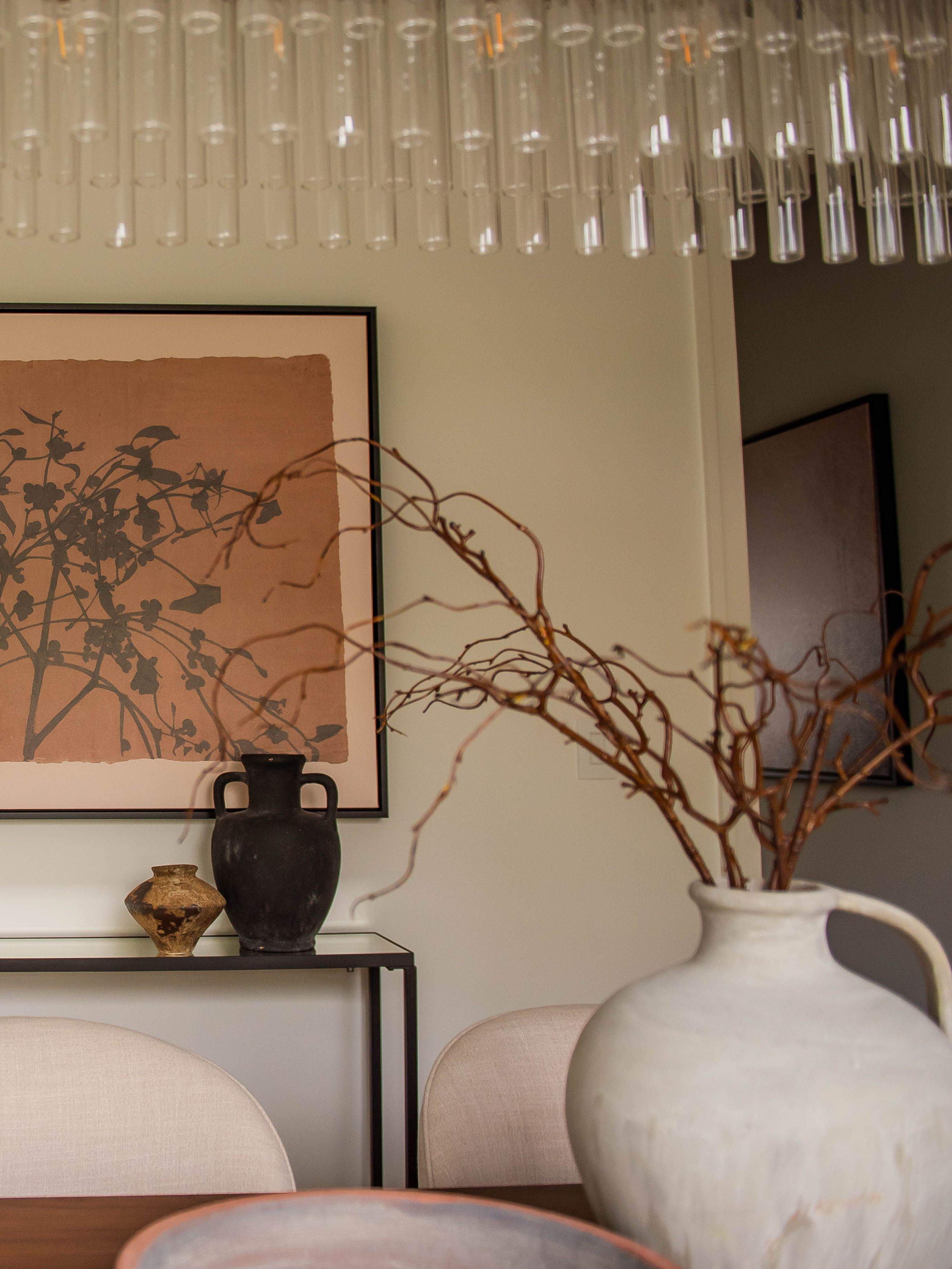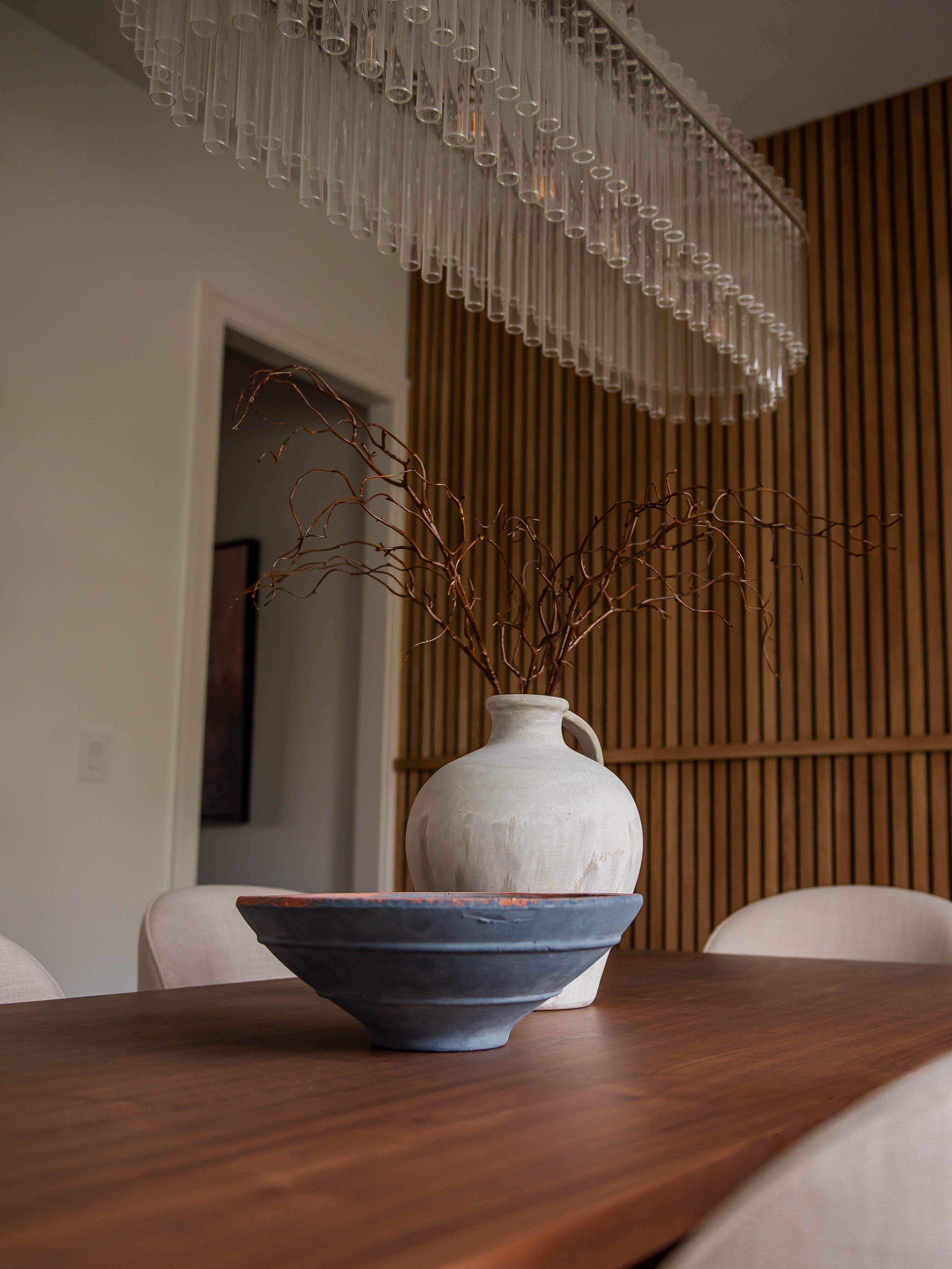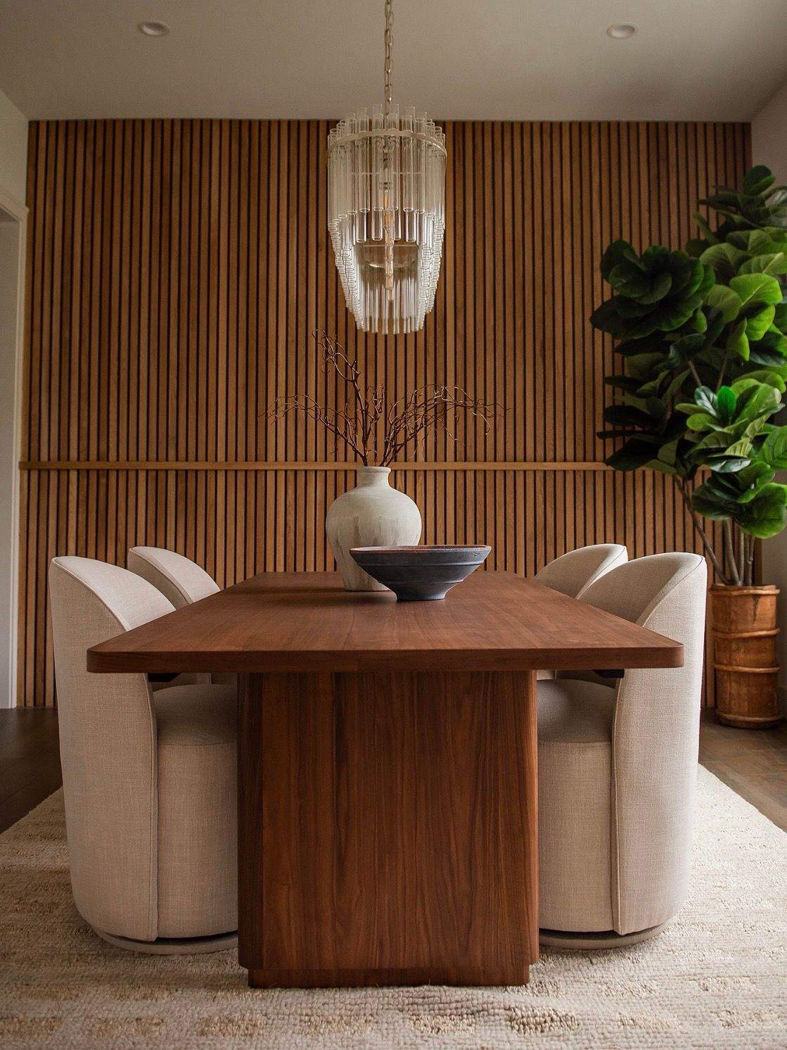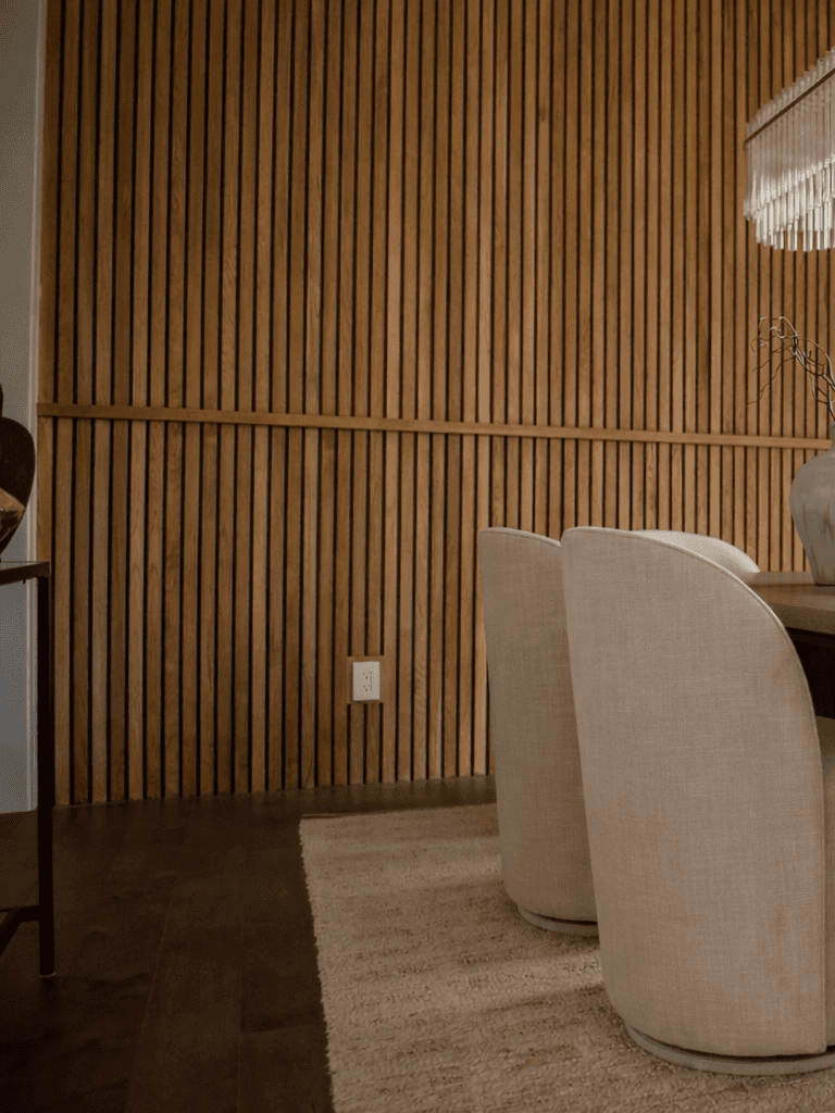 The transformation came through layering texture, warmth, and intentional details. In the formal dining room, we added a custom wood slat feature wall that instantly became a focal point and brought depth and richness to the space. By introducing earthy, grounded tones throughout, we balanced the crisp white walls and created a more welcoming atmosphere.