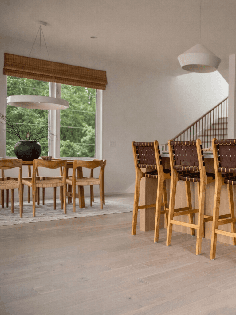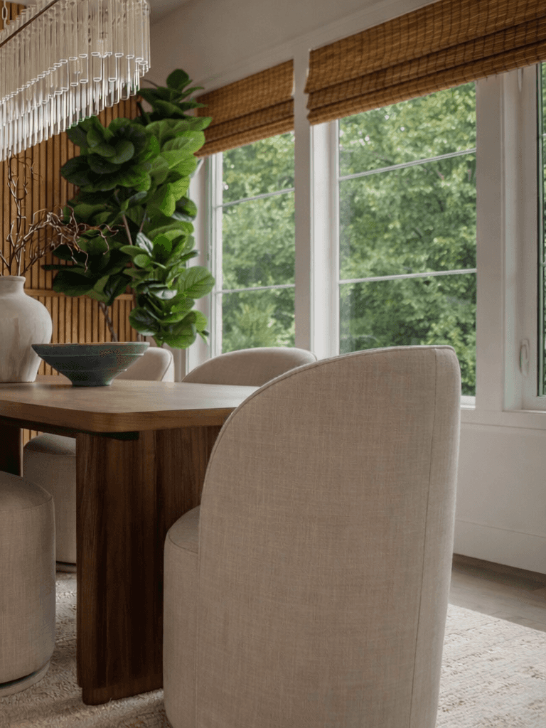 Custom bamboo roman shades softened the once-bare windows, and furnishings in natural materials—leather, linen, raffia, and wool, added texture and warmth. The result is a contemporary home that feels elevated yet cozy, refined yet approachable.