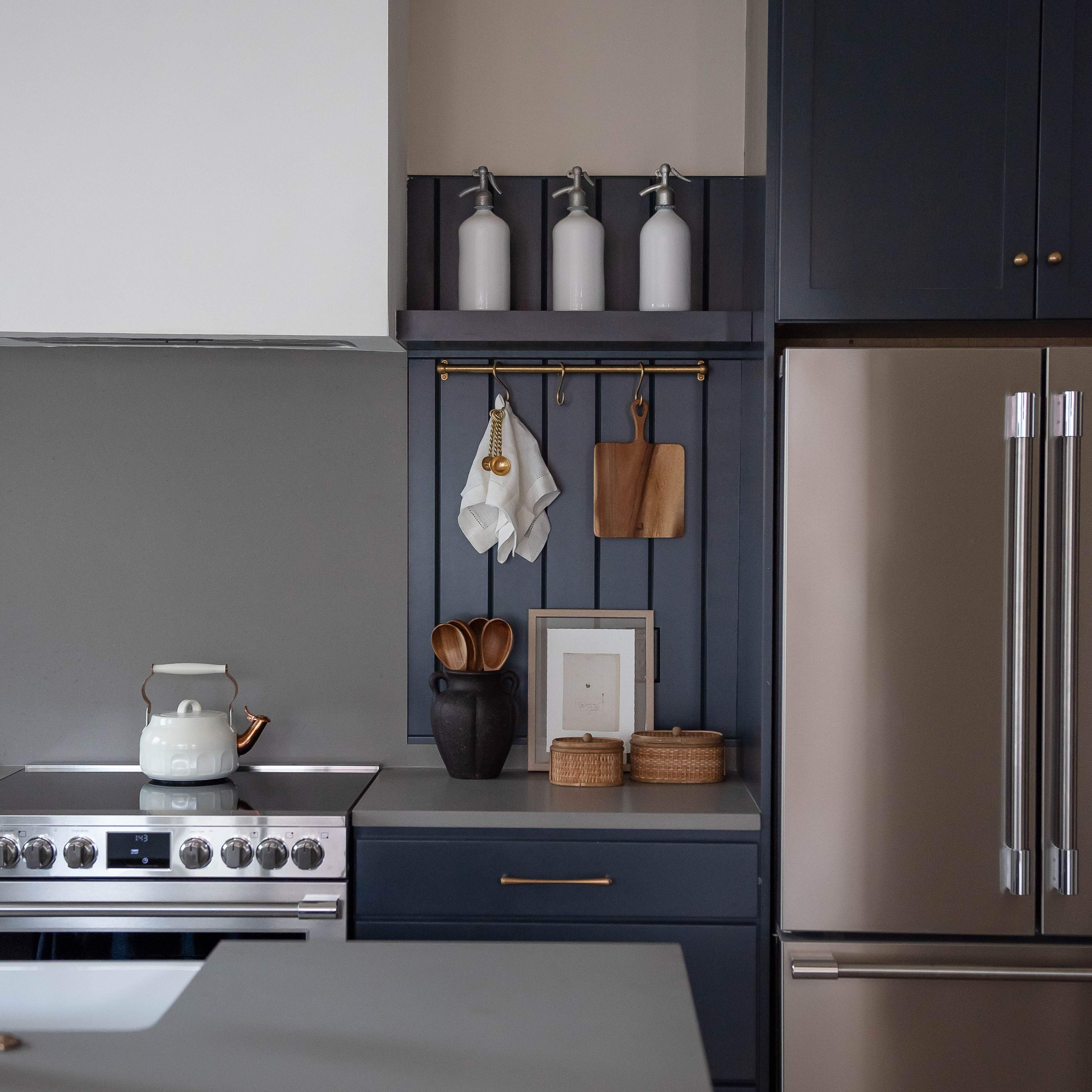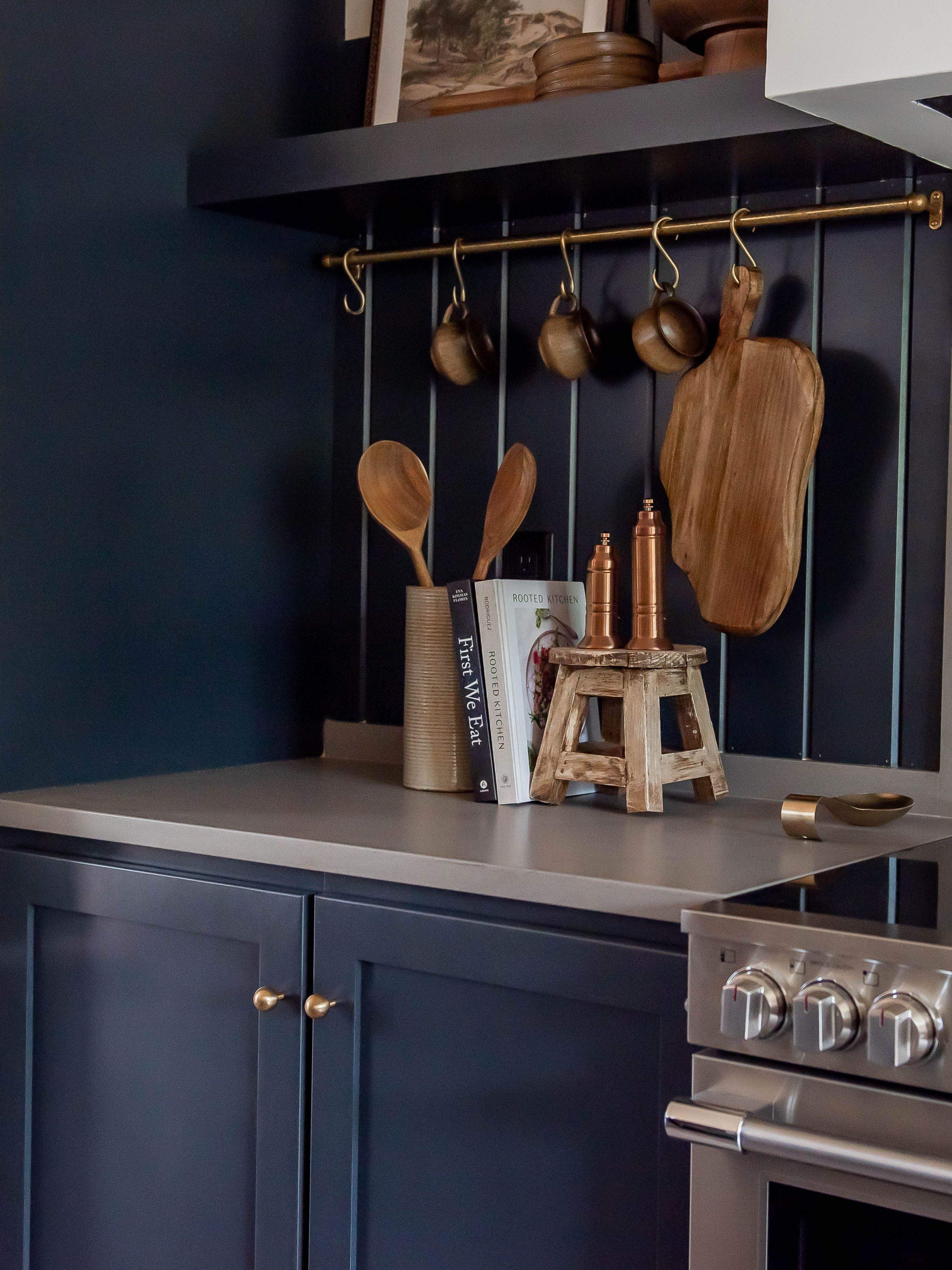 This project was such a joy to work on. The home is smaller with a more traditional architectural style, and the owners really wanted to infuse the kitchen with the kind of patina and character you’d find in a European home. We incorporated pot and pan racks hung from unlacquered brass rods to allow for natural aging and warmth over time. Shiplap was added to the backsplash to give the space an authentic sense of history and charm.
